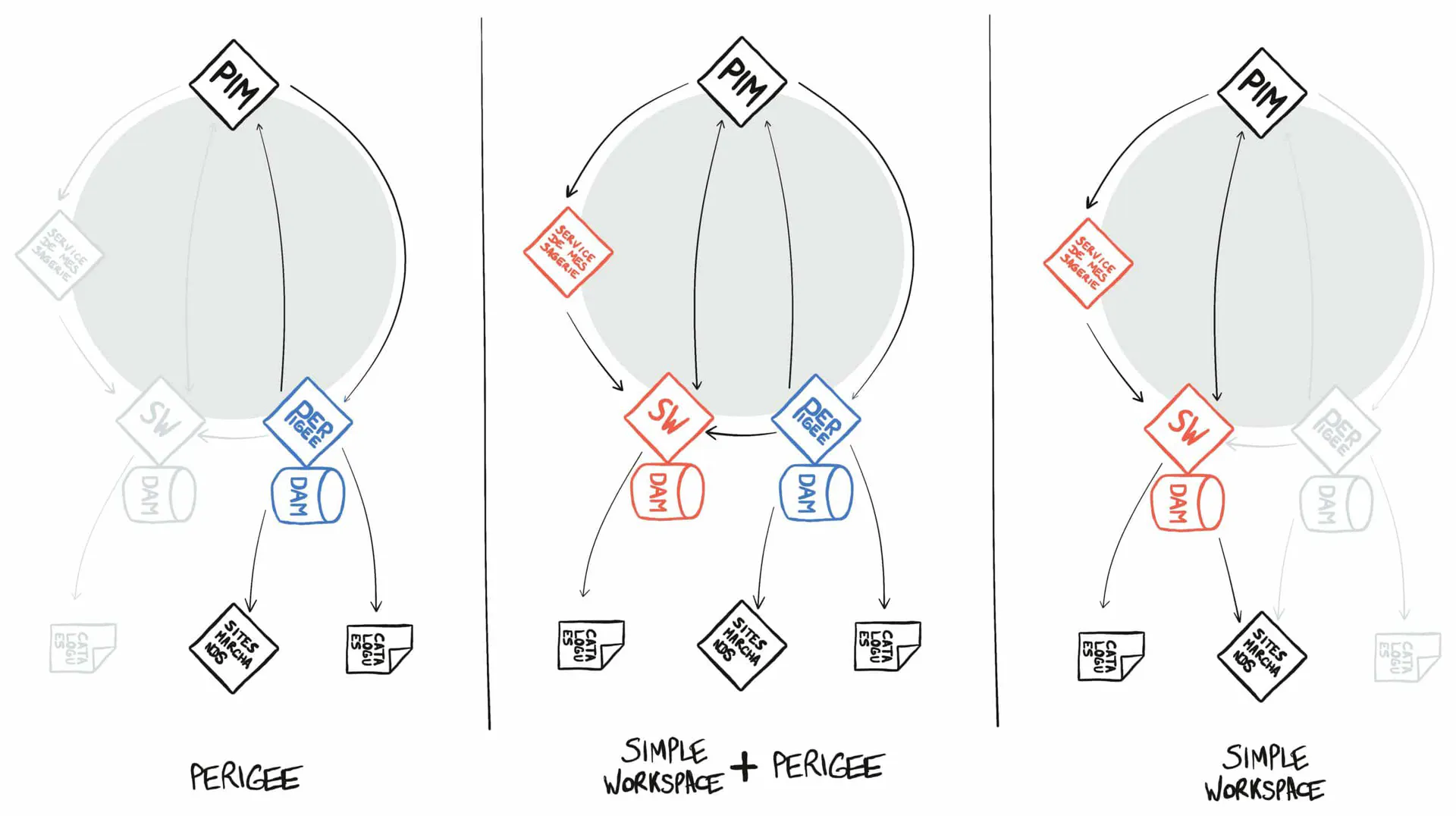 En matière de flux, durant la phase où les deux logiciels ont fonctionné de concert, le PIM les alimentait toutes les deux. Du côté des assets, la base de référence étant restée chez Perigee, un flux de mise à jour quotidien a été mis en place vers Simple Workspace.