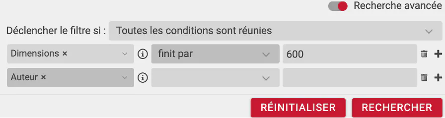 An image contains more than just pixels. That’s why we have EXIF-IPTC 1 2 metadata. Simple DAM includes metadatas, such as the date the image was taken or the photographer’s name. You can also add other properties to each image, like the “Dimensions” field in the screen above. This data is used by the search tool to quickly find all images, using stacked criteria as shown in the screen below.