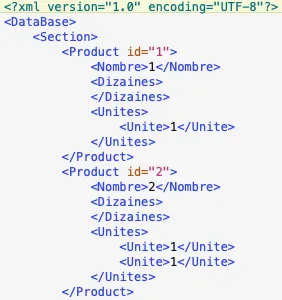 Chaque nœud Product est un enregistrement ; il contient les informations utilisées pour la fabrication d’une carte. (Dans un fichier Excel, cela correspondrait à une ligne.) Dans ce nœud, je vais retrouver les variables qui correspondent au nombre à écrire, aux unités, aux dizaines.